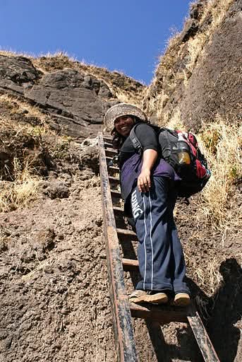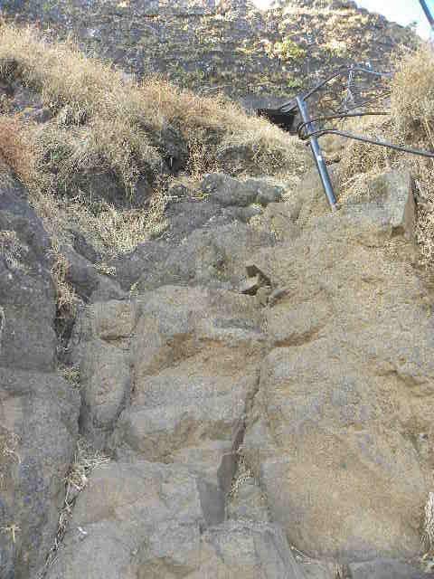 This ‘nedhe’ reminded me of Ratangad. To reach ‘nedhe’we had to climb rocks. After getting some much needed rest, we returned back to the house where we left our belongings. By 1.15 p.m. we were back and had our meal of usual Pitla bhakhar, we get during treks. We headed for the hut,that was located in the midst of the ridge by 2.30 p.m. The path was to semi-circum navigate the Sanjeevani machi and get down further via Alu Darwaja. We waited for all to get together, since some of them went ahead to explore Sanjeevani Machi. Around 4.30 p.m. we started descending from Sanjeevani Machi and heck! it was terrifying!