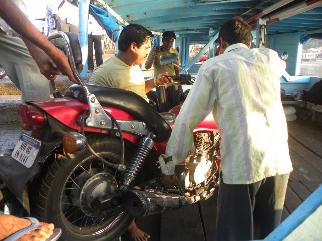 All of us who assumed that it would be very hot, were in for surprise with cool weather and wished for jackets. By 5.30 a.m. Deepak was up, nudging all to get up, as per the information by a localite, the first ferry was around 7.00 a.m. On the way to Murud, we got magnanimous view of Murud Janjira Fort. After a round of photo session, we continued towards Rajapuri. From here, we had to take boat to Dighi. Being a small boat, only bikes could be transported, it was a sight to view, as how the locals were actually lifting the bikes and dropping them in the boat.