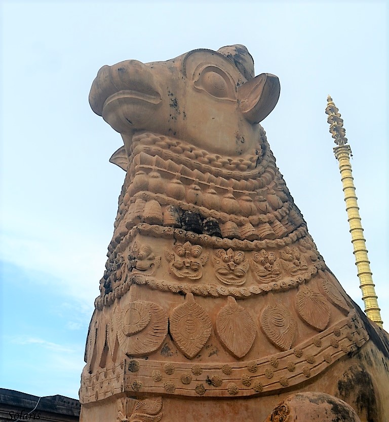 At the entrance, there is a well maintained Garden, further ahead greeted by a huge Nandi, which is almost 15 feet in length, 8 feet in breadth and 11 feet in height, sculpted in Stucco, brick stones and mortar. Nandi is placed in such a way that it reflects the light into the Sanctum. Huge Dwarpalas greet you at all entrances to the temple. There are few other smaller shrines around and one lion well called as Simhakeni.