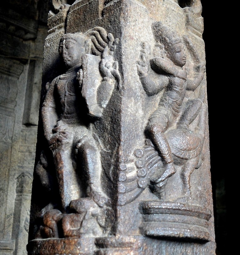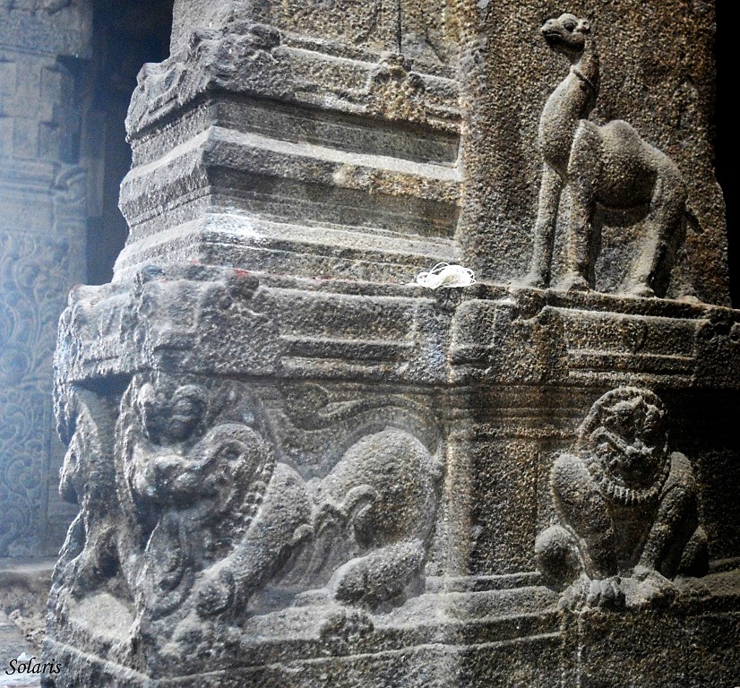 Inside the Sanctum, photography is not allowed. There is a 13 ft tall Lingam, representation of Shiva, in the Sanctum. The flooring of the Sanctum is made up of a stone called as Chandrakanta, which keeps the area cool in summer and warms up the area during winter. The mahamandapa is pillared and long. Due to less lighting, the interior is dark, but the Pillars are sculpted well with deities & animals. I found the camel carving interesting, a lady in dancing pose, Shakti Ganapati, Karthikeya etc.