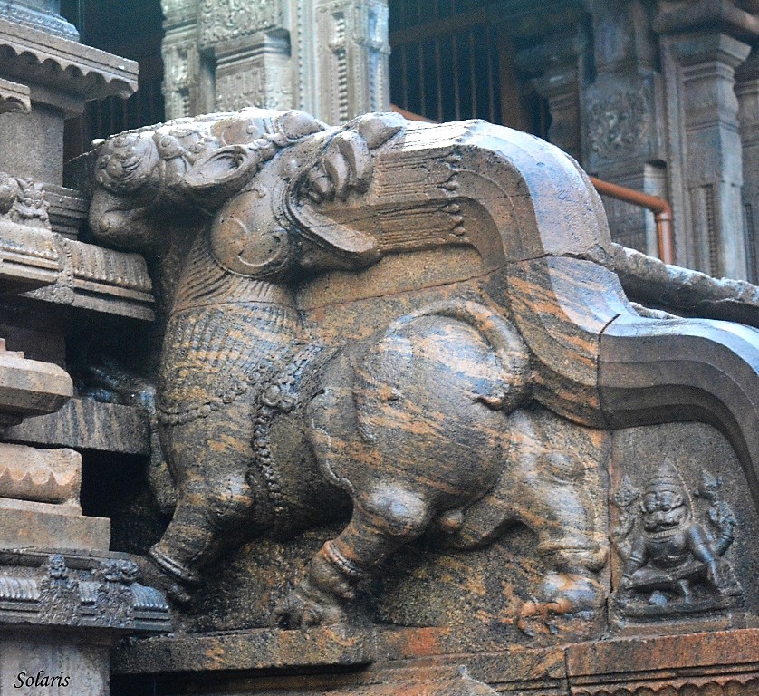 Beyond the main Gopuram, there is 33,000 sq.ft. temple complex. First is the Nandi Mandapam, where 12 foot tall monolithic intricately carved Nandi sits. Being evening, the place was bit crowded. At the temple entrance, again the Dwarpalas greet you.