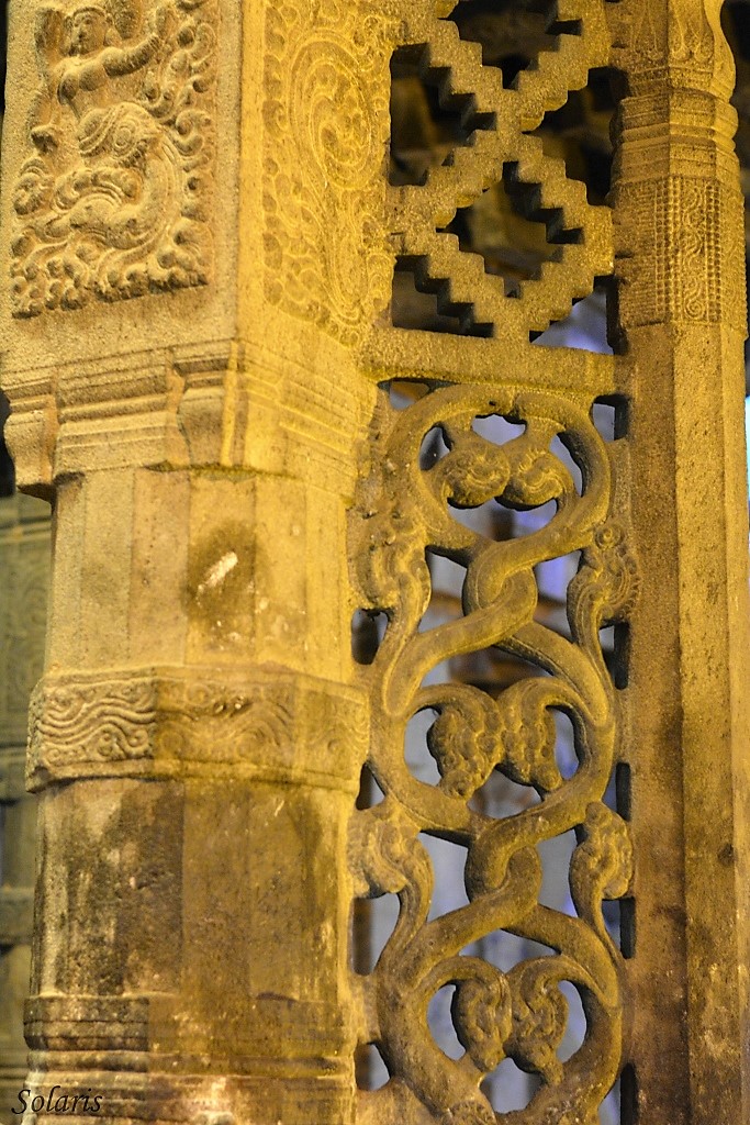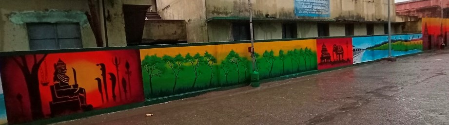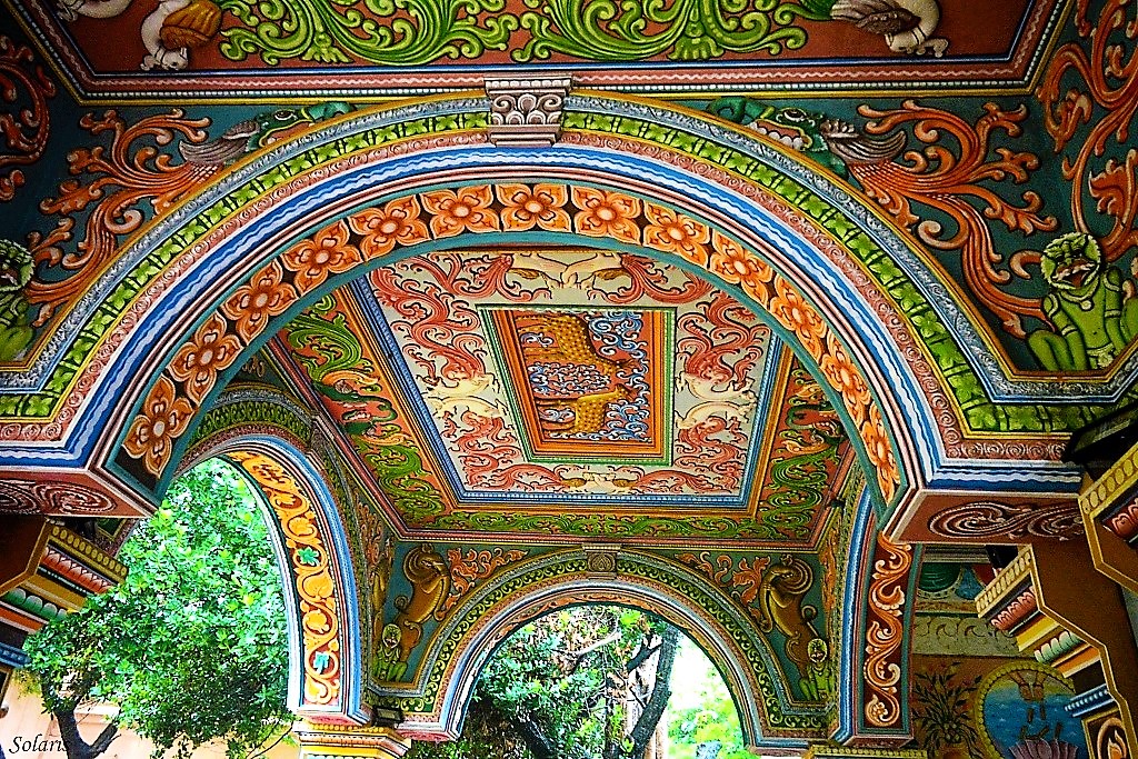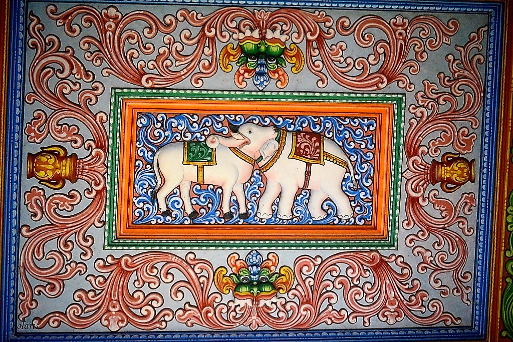 The temple walls are decorated with intricate Mural Paintings. The second storey around the Garbagriha has Eighty-one of the one hundred and eight karanas or poses of Bharatanatyam.