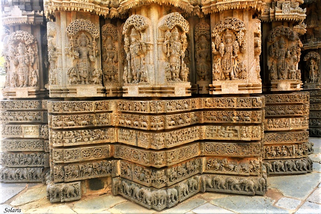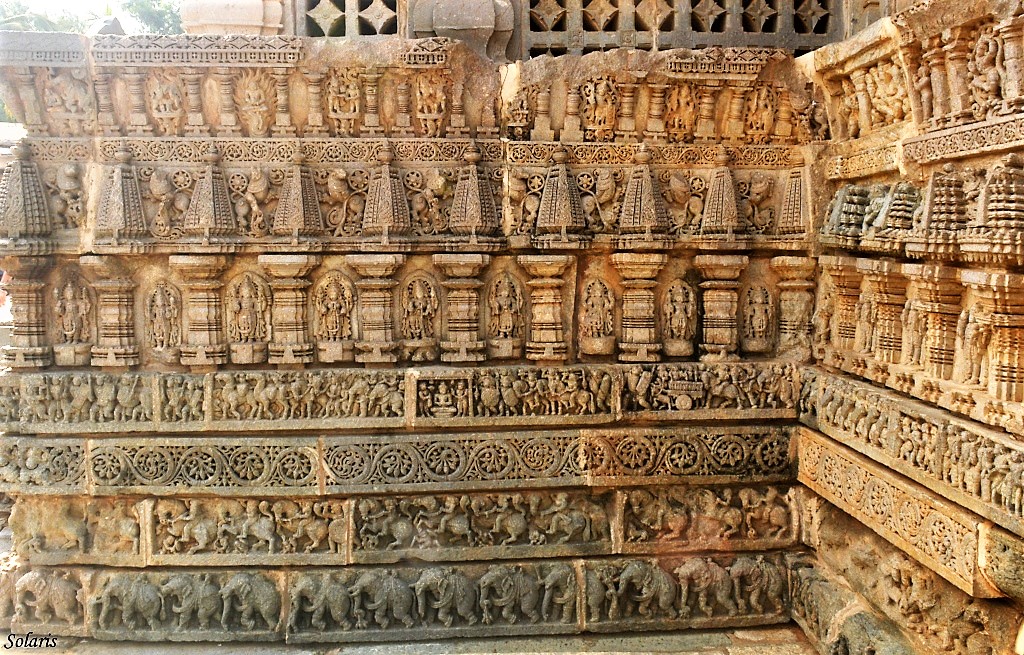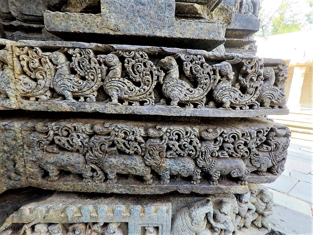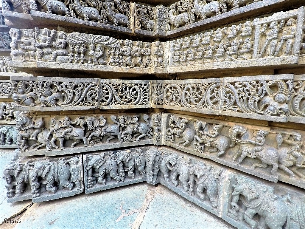 There are friezes of Gajadhara at bottom, Ashvadhara, Creepers, Yalli and Swans, all in layers, one above other.