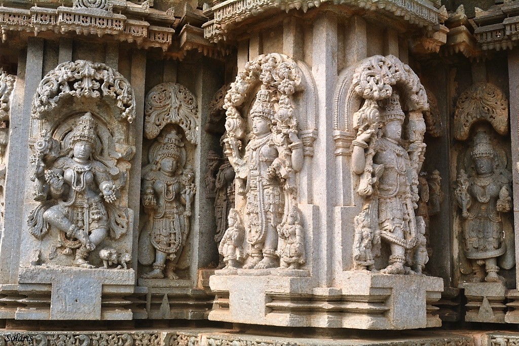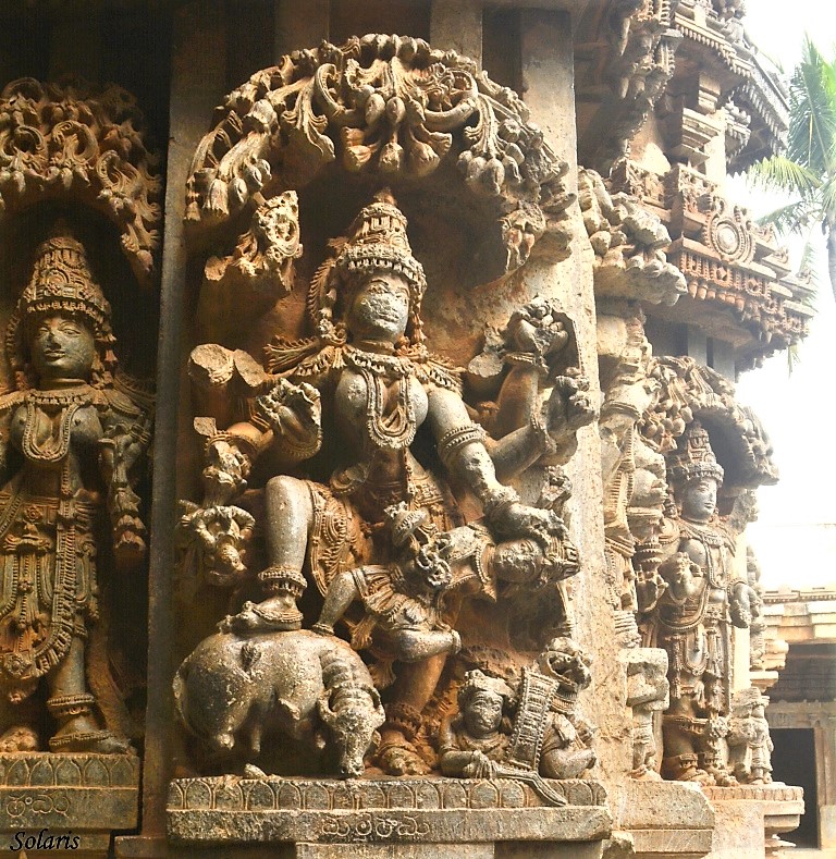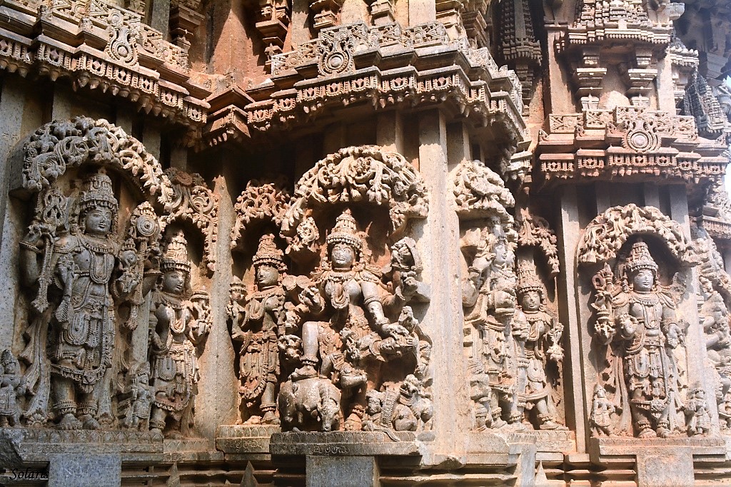 There is a common Mandapa connecting three temples dedicated to Keshava, Janardhana & Venugopala, three different forms of Vishnu. Each temples with carved Vimana over the Garbhagriha. There is a Prakara around the Temple, with Prakara Mandapa. The outer walls of the temple are also carved with exquisite sculptures of Gods & Goddesses and different episodes of Mahabharata, Ramayana and other Puranas can be seen.