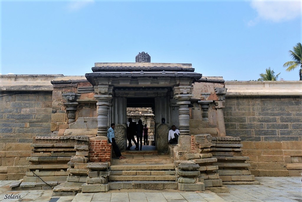 There is a huge Mahadwara in the form of Mandapa with adjoining Basadis on both sides. These Basadis were used to keep the Idols safe from the attacks, during the Tughlaq attack. Temple is constructed on a raised star shaped Adisthana or Jagati like other Hoysala Temples. Like Belur Temple, here also, the Dwarpalakas Jaya & Vijaya are heavily decorated.