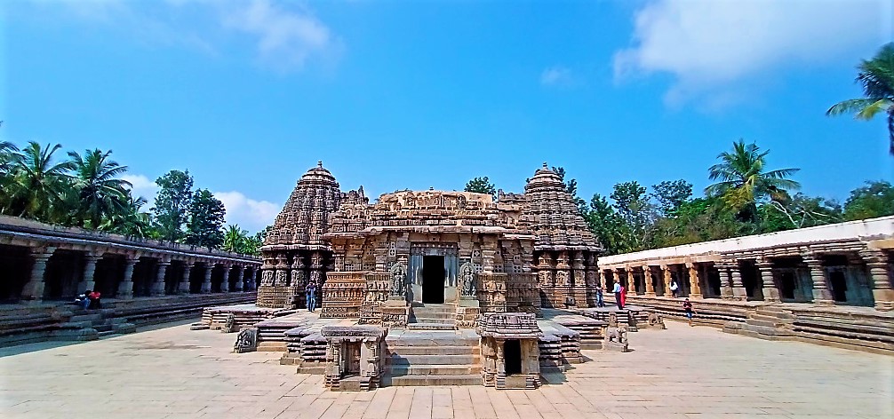 Main attraction of Somnathpura is the Chennakesava Temple. This temple was built by Somanatha Dandnayaka, a Hoysala General under King Narasimha III in 1268 A.D. Temple is constructed from Soapstone (easily moldable, initially soft, later when exposed to heat & air, it hardens). This is one of the three masterpieces representing finer and intricately beautiful Hoysala Architecture (other two being Belur & Halebid in Hassan District).