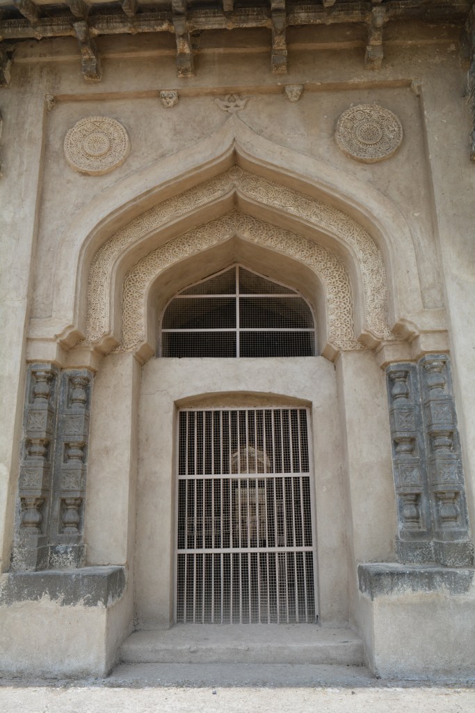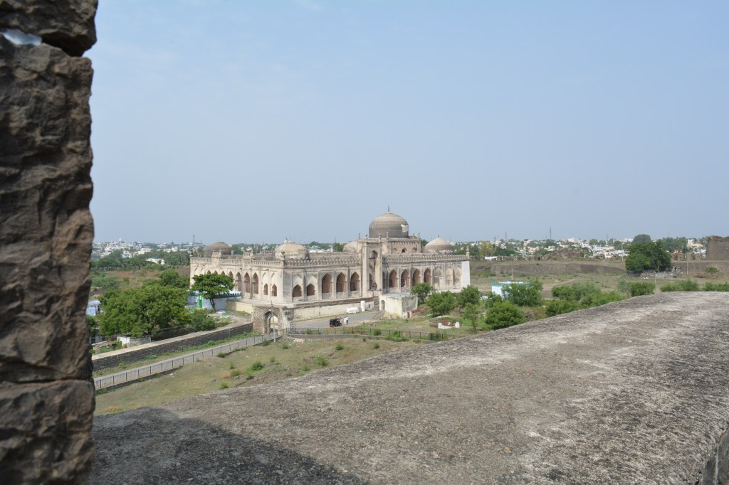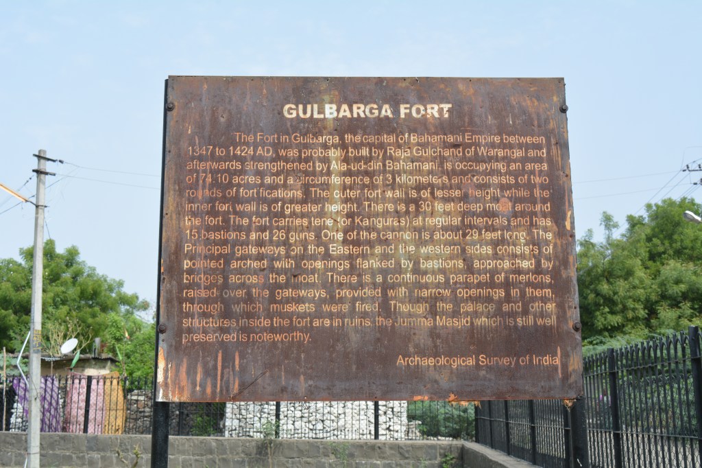 My first stop was Gulbarga Fort, a 14th-century structure originally built by Raja Gulchand of Warangal and later fortified by the Alauddin Hasan Bahman Shah, the Bahmani Sultanate between 1327 and 1424. The fort, though in ruins, still had its notable features, such as the Ranmandal Bastion, which housed three large cannons and the Jamia Masjid. The Fort has 15 Towers (Bastions) and 26 guns with 30 feet (9.1m) deep moat built around. Each gun located inside the fort is 8 metres (26 ft) long and is still well preserved. (It is said that the Bahmani Sultanate claimed lineage of the Sasanians and the motifs on their buildings, particularly the crowns of the arches that they built depicted an emblem of the crescent and occasionally a disk that was closely reminiscent of the crowns of the Sassanian emperors.)